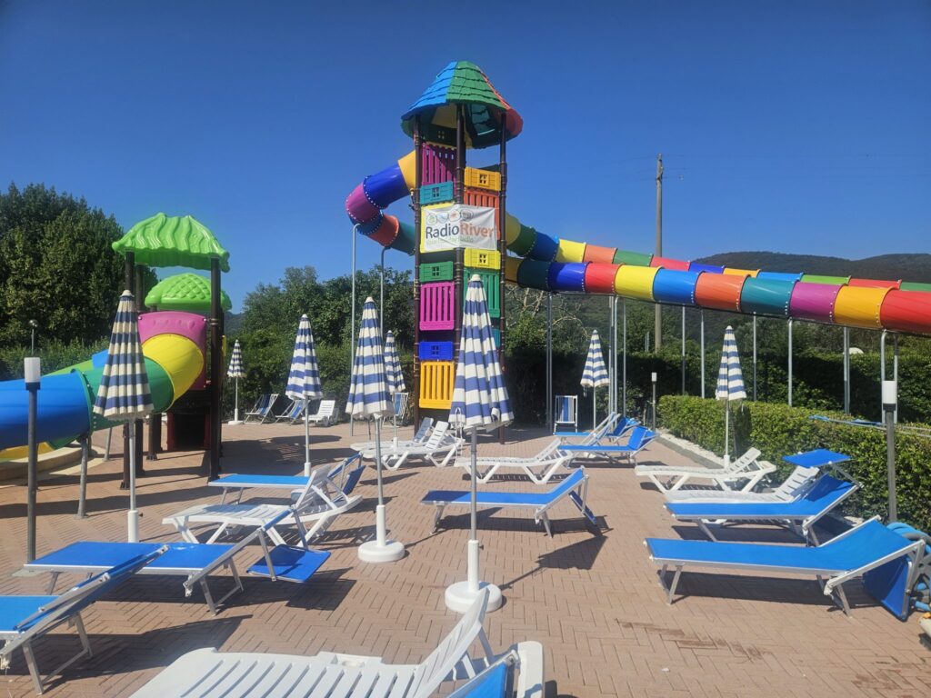 Geniet van de zwembaden met de glijbanen voor de durfal, al luisterend naar River Radio.